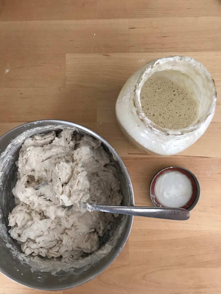 First things first, you need that starter. If you don’t have one, you can’t substitute dry active yeast in here. It just won’t have that sour tang that makes sourdough sourdough. Go Pinterest search a guide to making your own starter and come back here in a week when it’s ready and has a name. My starter’s name is Bonnie.