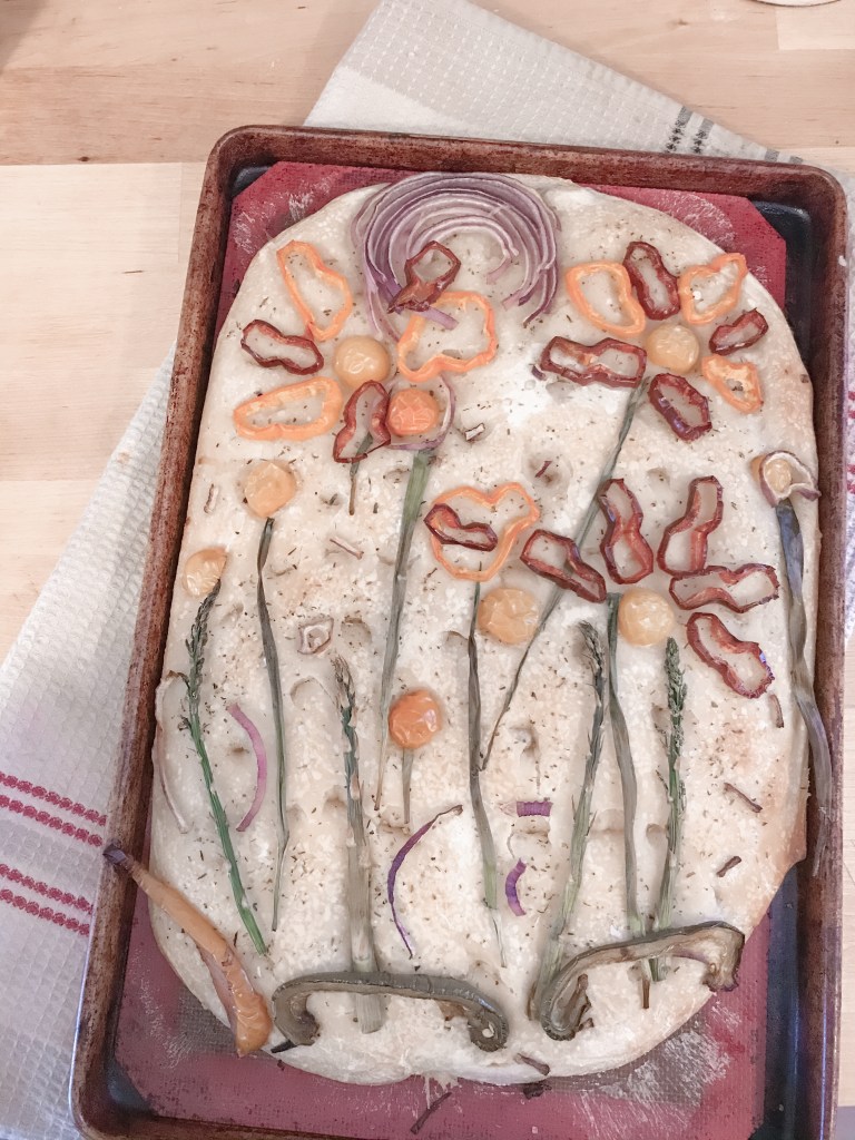 Focaccia is a flat bread with a crispy top and a soft centre filled with air bubbles. We decorated ours with a spring vibe for an Easter appetizer. The kids had so much fun making veggie flowers.