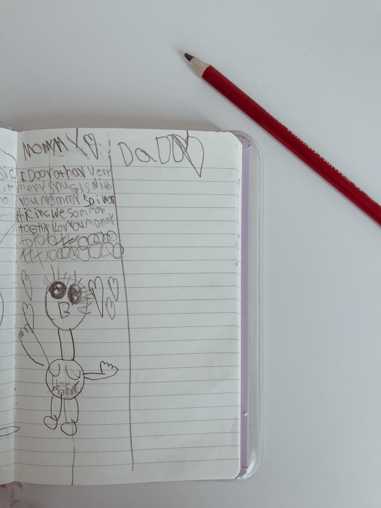 I was tidying the house and came across a few notebooks that the kids use for pictures and stories and notes, and came across this one from my daughter.